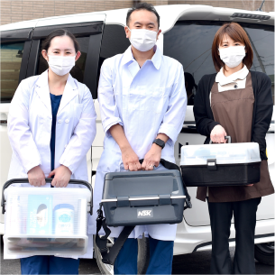 当院は訪問診療を行なっています。歯科医師、歯科衛生士が、ご高齢でお身体が不自由な方、障がいがある方など、通院することが困難な方のご自宅や施設に伺い、口腔ケアやむし歯・歯周病治療、入れ歯の製作・調整などを行います。